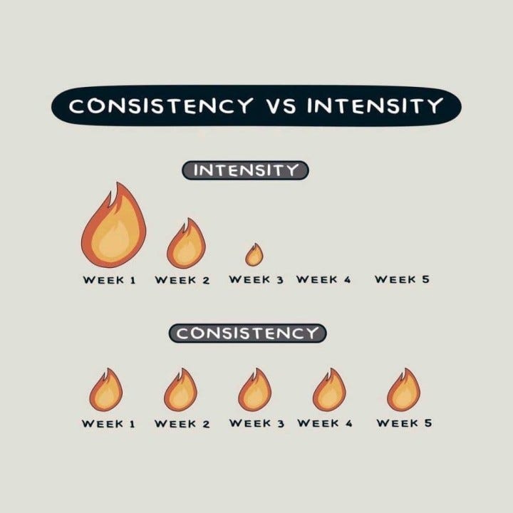 The truth is, consistency consistently makes intensity look foolish. While intensity might steal the spotlight with its quick bursts of effort and flashy results, consistency works in the background, quietly building something more durable, more sustainable. But here’s the catch: consistency, by nature, is dull. It’s slow growth, often imperceptible on a day-to-day basis.